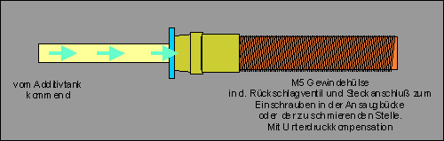 Bohren Sie ein 4,2mm Loch in die Ansaugbrücke. Schneiden Sie ein M5 Gewinde ein. Schrauben Sie die Additivdüse unter Verwendung von Gewindedichtpaste ein, bis das Düsenende ca. in der Mitte der Lüftansaugöffnung endet. Sichern Sie die Gewindehülse mit der Kontermutter. Den Additivschlauch erst nach dem Entlüftungsvorgang einstecken. Verwenden Sie nur unsere mitgelieferte Einleit-Düse, da diese den Unterdruck im Luftansaugweg kompensiert. (Dokumentation)