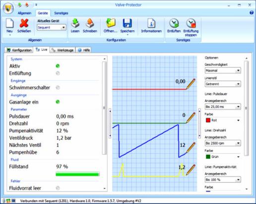 Starten Sie das Fahrzeug und beobachten Sie den Monitor. Wenn das Fahrzeug auf Benzinbetrieb läuft sollte die Pulsdauer im Live-Monitor auf 0 stehen bleiben. Wenn Sie auf Gasbetrieb schalten werden die aktuellen Einspitzzeiten der Gasventile am Monitor angezeigt. Die Pumpenaktivität sollte sich dann gegen 100 % füllen. Wenn 100 % erreicht sind wird eine Additivdosierung ausgelöst und die Pumpenaktivität zurück auf 00 gesetzt. Über die Konfiguration können Sie die Additivbeimischung auf den jeweiligen Fahrzeugtyp anpassen. Hinweis, nach ca. 1000 gefahren Kilometern im Gasbetrieb sollte die entnommene Additivmenge kontrolliert werden. Die Additiventnahme sollte ca. 1 Promille der verbrauchten Gasmenge entsprechen (Bitte beachten Sie die Angaben der Additivhersteller).