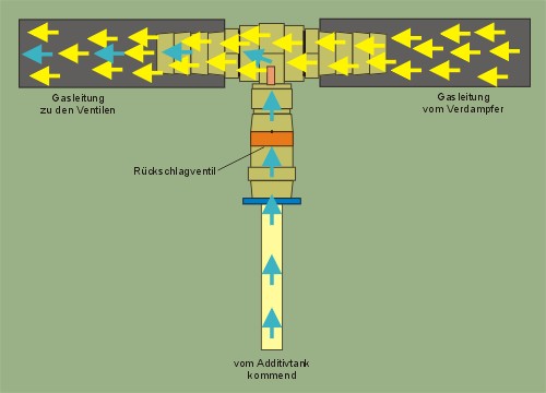 Montieren Sie die Additivweiche in den Gasschlauch zwischen dem Verdampfer und den Gasdüsen. Drehen Sie den Additivanschluss nach unten um eventuelle Gasblasenbildung zu verhindern. Sichern Sie das T-Stück mit den beiliegenden Schellen. Den Additivschlauch erst nach dem Entlüftungsvorgang einstecken. Da bei dieser Betriebsart Additiv in den Gasstrom eingeleitet wird, beachten Sie die Hinweise der Hersteller hinsichtlich der Materialverträglichkeiten. (Dokumentation)